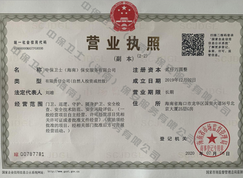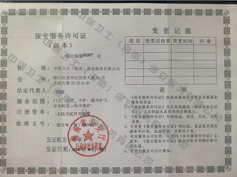 常州俊峰精密加工服务有限公司是经海南省公安厅批准,依法持有《保安服务许可证》,提供保安服务、门卫、巡逻、守护、区域秩序维护、随身护卫、安全检查的专业化保安服务公司。